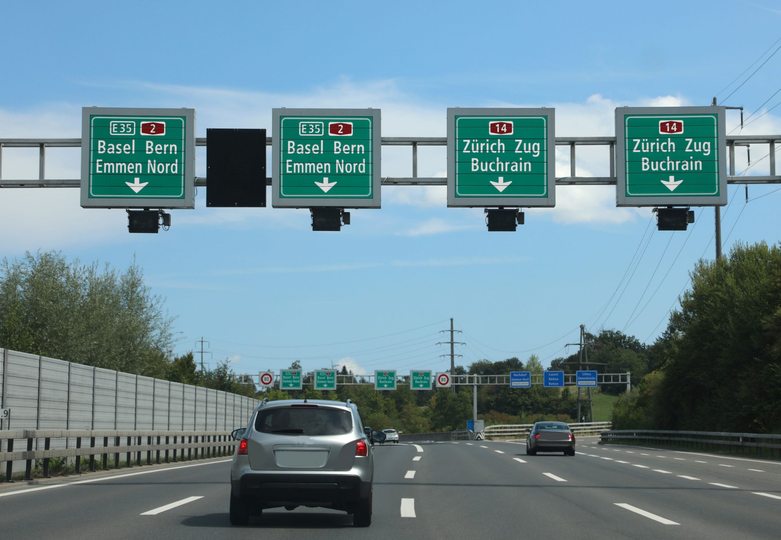 Schweizer Autobahn mit grün-weißen Schildern.